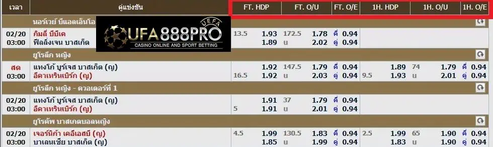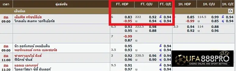 - การแทงแบบ FT O/U มีการกำหนดอัตราสูงต่ำอยู่ที่ 222 แต้ม