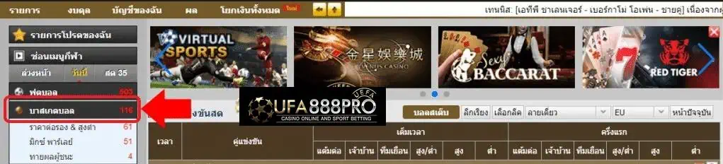 - หลังจาก ล็อกอิน ufabet เรียบร้อย ให้มองไปที่ฝั่งซ้ายมือและเลือก บาสเก็ตบอล